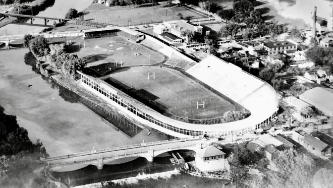 The brand new Iowa Stadium opened for business in the fall of 1929. On October 19th, the stadium was dedicated. Ten days later (October 29), the stock market crashed, and over the next decade, nearly every family across America struggled to make ends meet. For the SUI football program, things were doubly bad. The Big Ten temporarily suspended Iowa from conference play, leaving the Hawkeyes to schedule games with lessor schools. Crowds were sparse (see pic below), but still, the Hawkeyes played on.