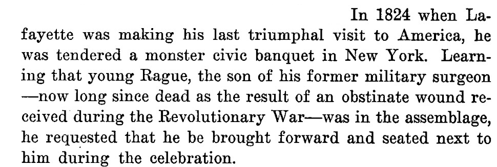 John Francis Rague‘s father, John Rague (pronounced Ra-gu‘), Sr. was a surgeon who came to America from France as the personal physician to General Marquis de Lafayette during the American Revolution. After the war, the good doctor married and resided for a while in New Jersey. The family Bible, which came from John Jr.’s Presbyterian mother, Hannah, states in the birth records…