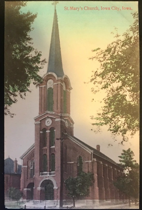 The first Mass in Iowa City was celebrated by a frontier missionary, the Rev. Samuel Charles Mazzuchelli on December 20, 1840. It was attended by 28 people in a building that doubled as a private home and a hotel owned by Ferdinand Haberstroh. The previous day, Mazzuchelli had arrived from Burlington, securing two lots on which St. Mary’s church and rectory still stand today – 220 E. Jefferson. St Mary’s parish (a small wooden structure) was established here by Mazzuchelli in 1841, named St. Mary of the Assumption, and was largely completed by 1842. A larger church was completed by 1865, and the current structure (above right) was built around the existing one in 1869. The 140-foot steeple was added in 1874 and St. Mary’s was designated by Bishop Martin Amos as a pilgrimage site for the Year of Mercy, as promulgated by Pope Francis on December 8, 2015. Read more here.