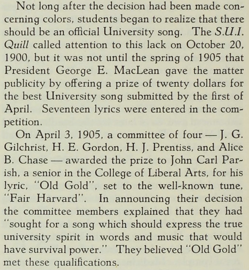 As we close, notice below that in 1947, the writer of this article, Cornelia M. Barnhart, not only tells us about the very first time Old Gold was sung on campus (June 1909), but her hope was that in 2047, when the University of Iowa celebrates her bicentennial, that this classic hymn will still be the centerpiece of our celebration…